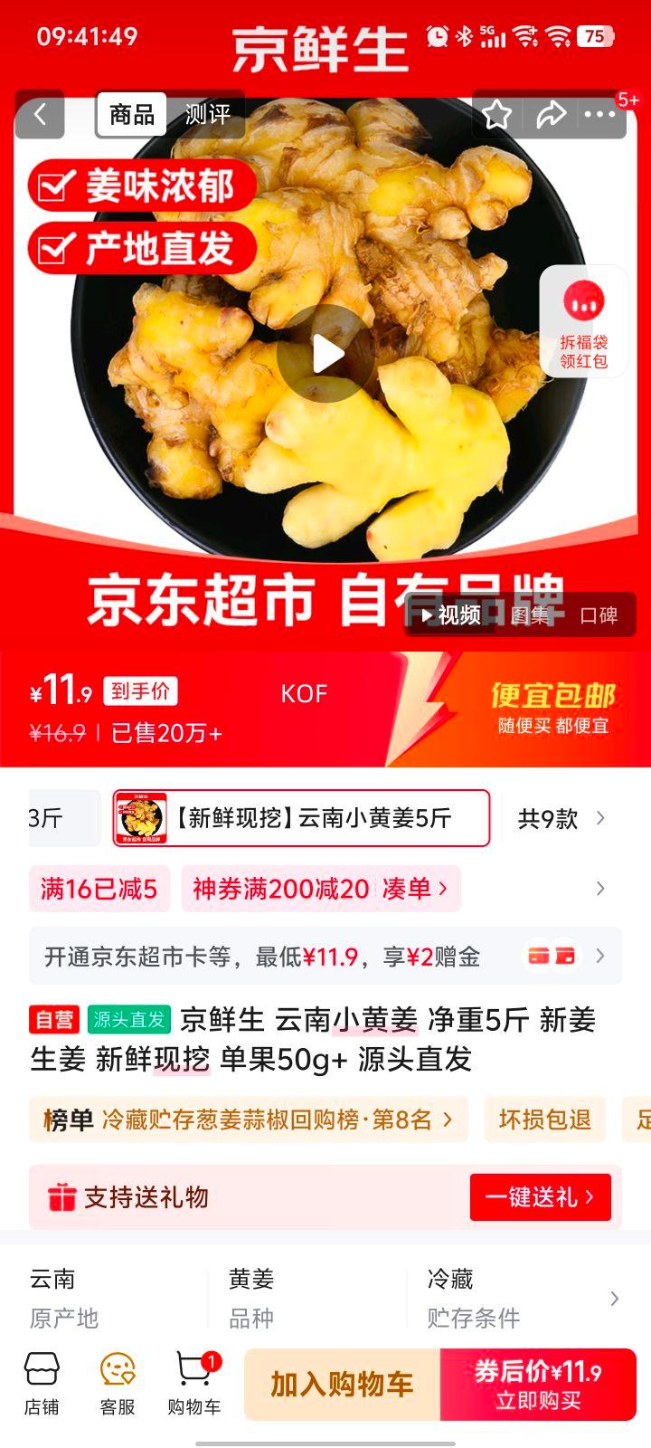 > 京鲜生 云南小黄姜 净重...