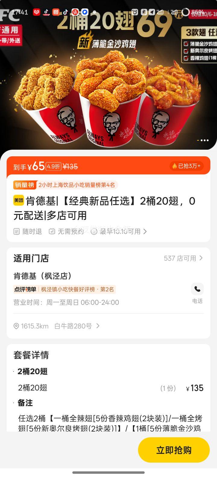 再降价:美团 肯德基 【经典新品任选】2桶20翅,0元配送
