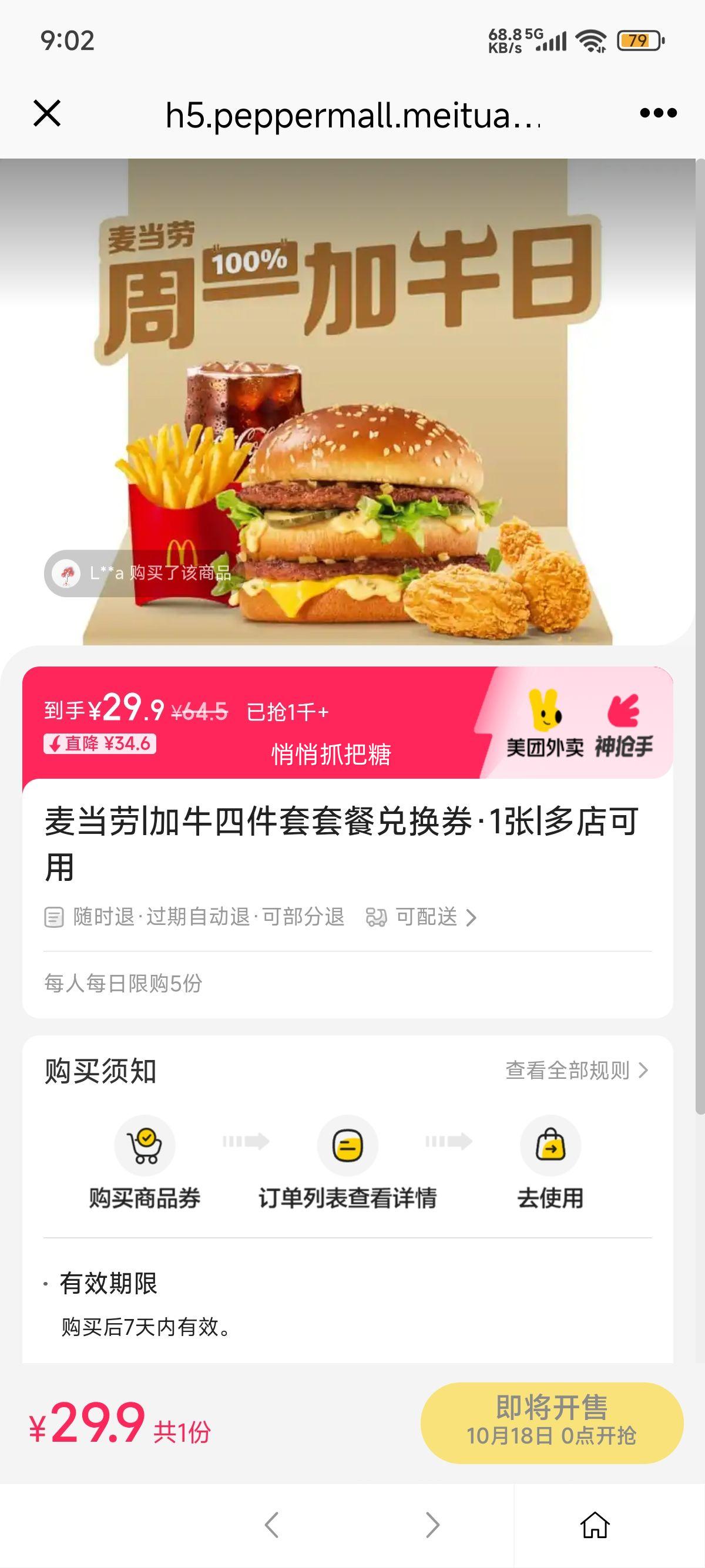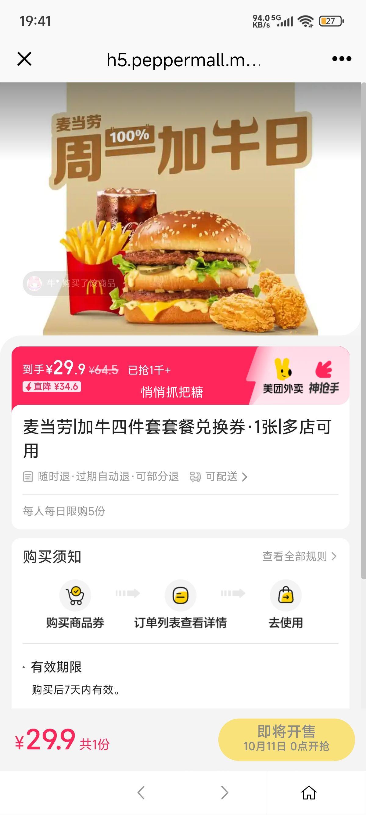 美团外卖 麦当劳 加牛四件套套餐兑换券·1张