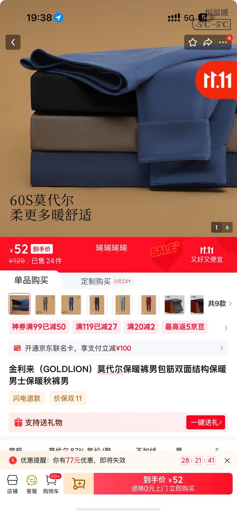 goldlion 金利来 男士莫代尔包筋秋裤保暖裤
