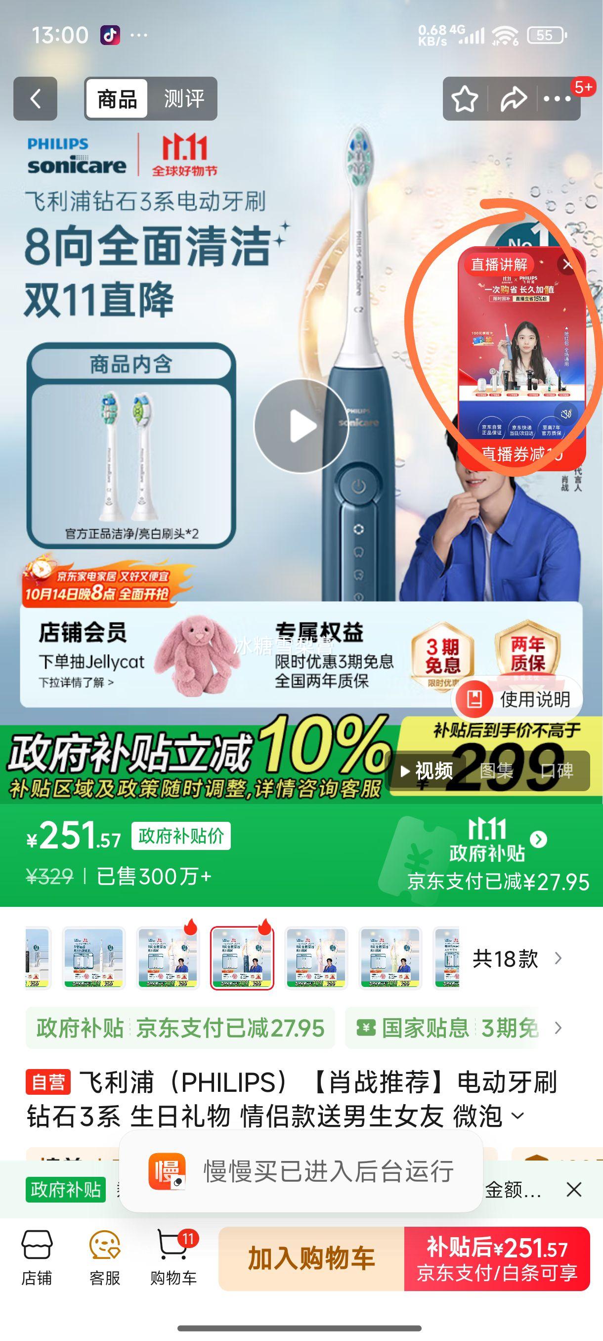 闭眼买:飞利浦(PHILIPS)【肖战推荐】电动牙刷钻石3系 生日礼物 情侣款送男生女友 微泡水流HX5181/02星云蓝 国家补贴