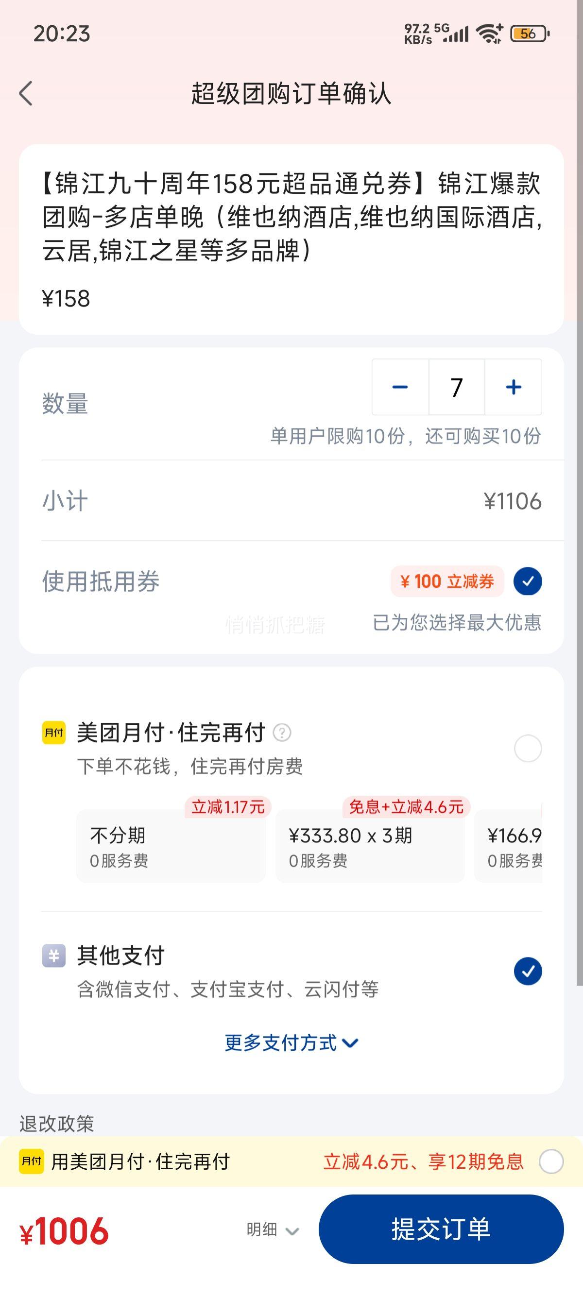 7晚1006元(合143.71元/晚)可分开核销,过期退随时退