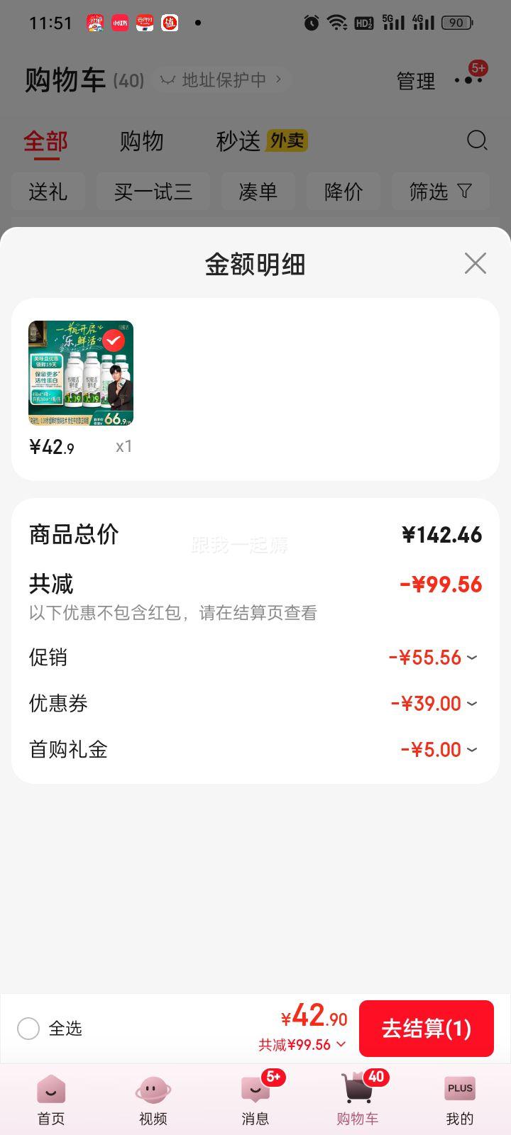售价142.46元,下单领取满99减19元,满99减20元,首购礼金5元优惠券,参与满1件打6.1折优惠活动,下单1件,实付低至42.9元。