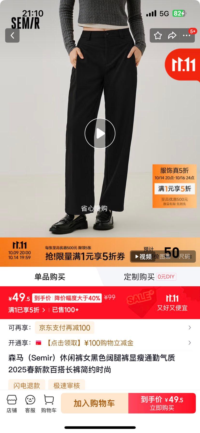 森马(Semir)休闲裤女黑色阔腿裤显瘦通勤气质2025春新款百搭长裤简约时尚 黑色