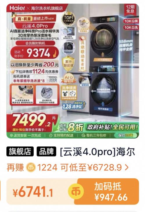 再降价、88VIP:[云溪4.0pro]海尔新品洗烘套装双擎热泵洗衣机超薄精华洗直驱75 晶釉蓝