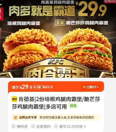 已售6千+!美团到店 肯德基 2份培根鸡腿肉霸堡/脆芒莎莎鸡腿肉霸堡