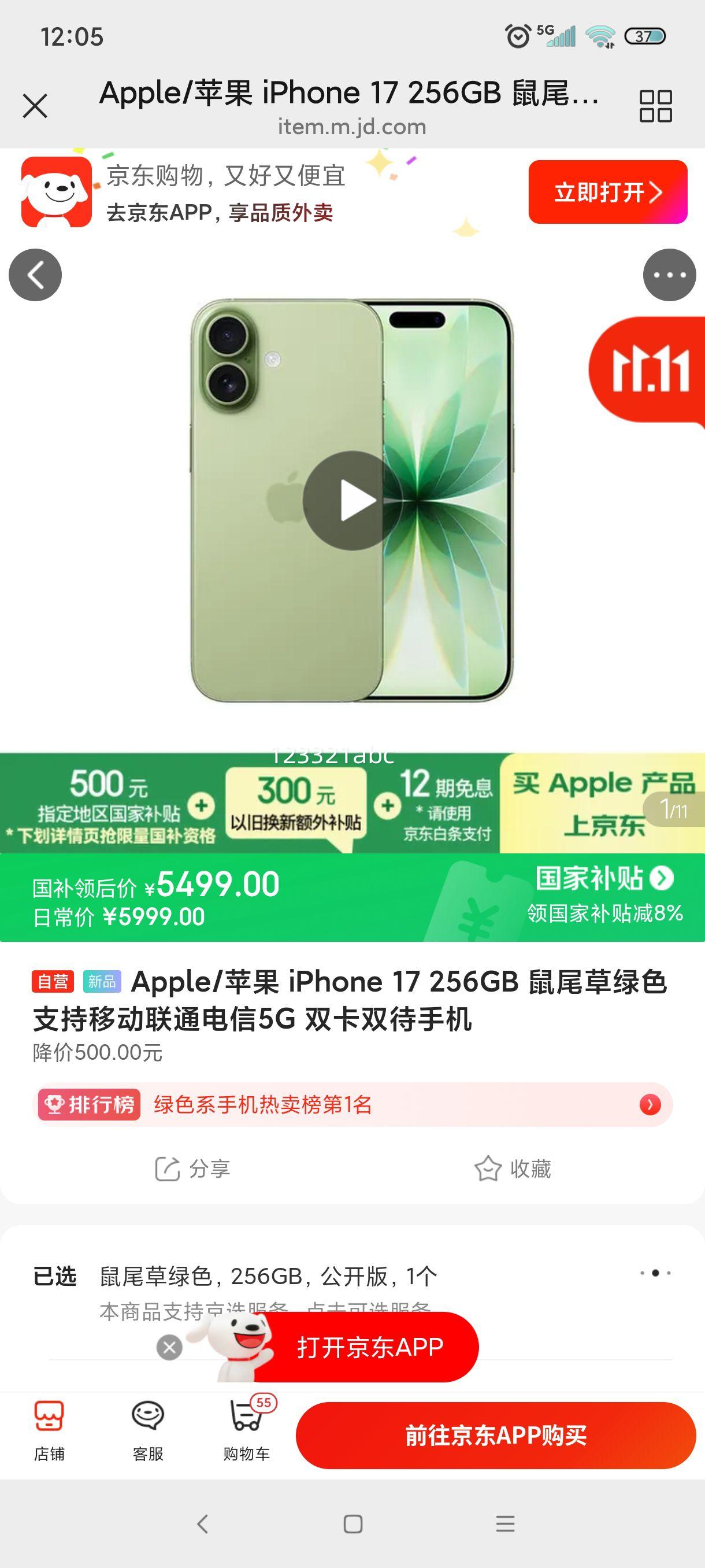 Apple/苹果 iPhone 17 手机 双卡双待 鼠尾草绿色 256G