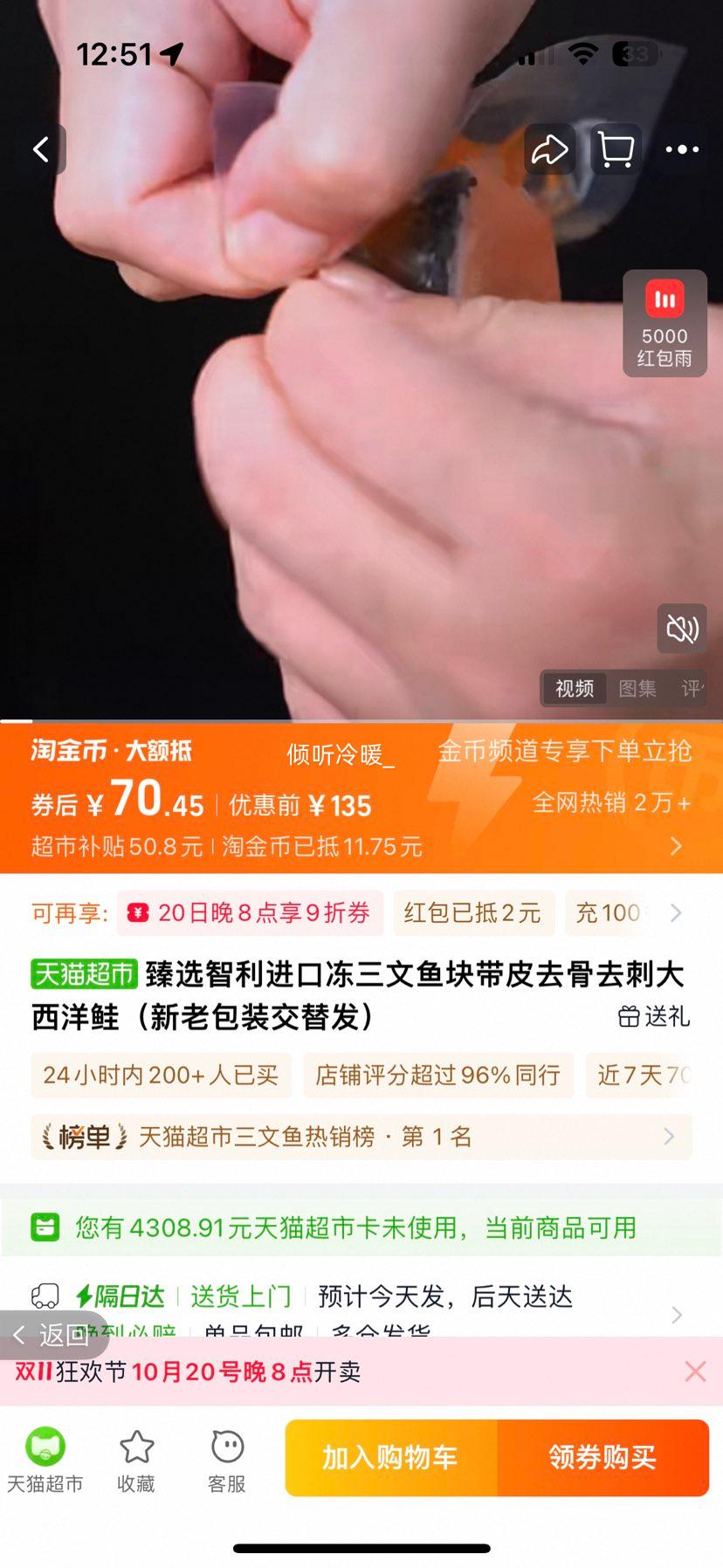 闭眼买、再降价:喵满分 冻三文鱼块大西洋鲑1kg