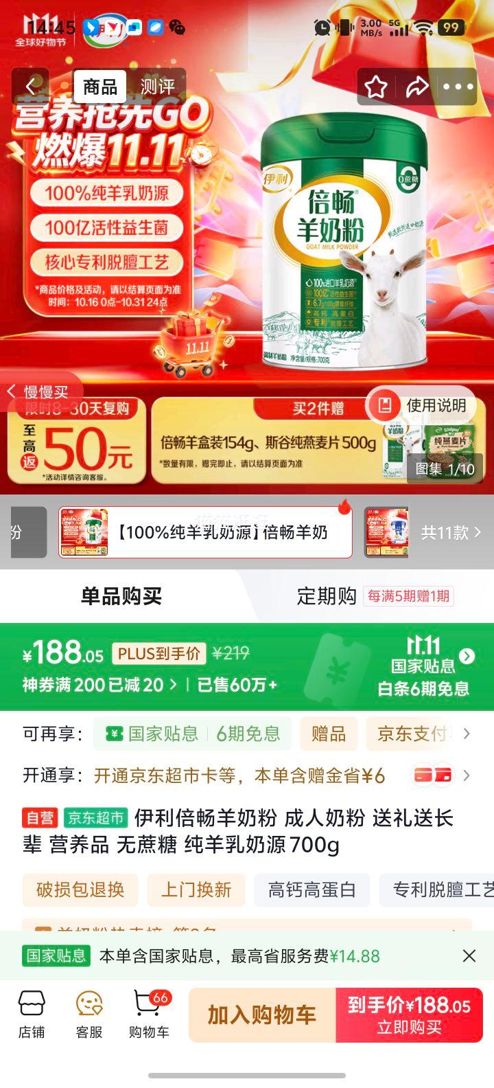 伊利倍畅羊奶粉 成人奶粉 送礼送长辈 营养品 无蔗糖 纯羊乳奶源 700g