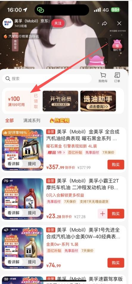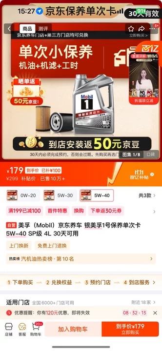 闭眼买、再降价:美孚 保养单次卡 银美孚1号汽机油5W-30 SP级 4L 含机滤包安装