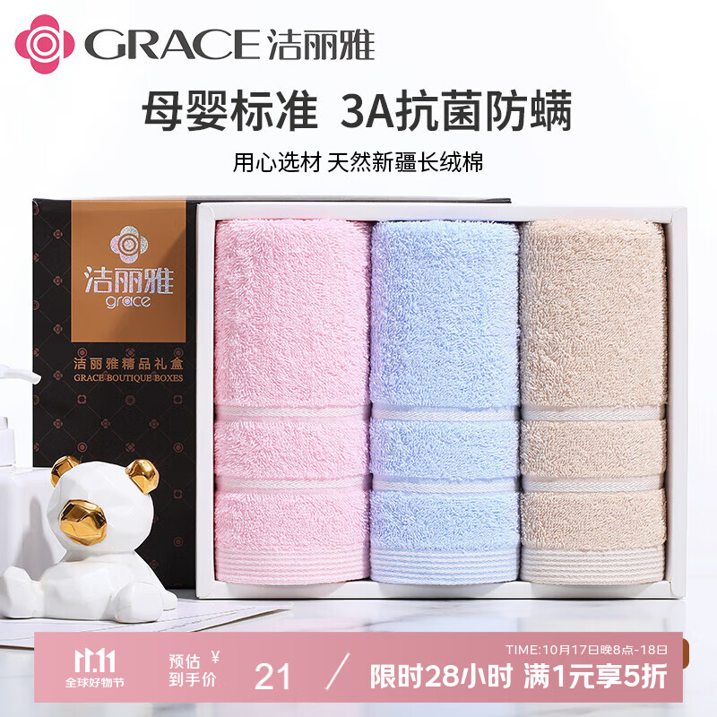 洁丽雅 毛巾礼盒3条装A类商务纯棉洗脸巾 公司员工福利 礼盒可绣字定制