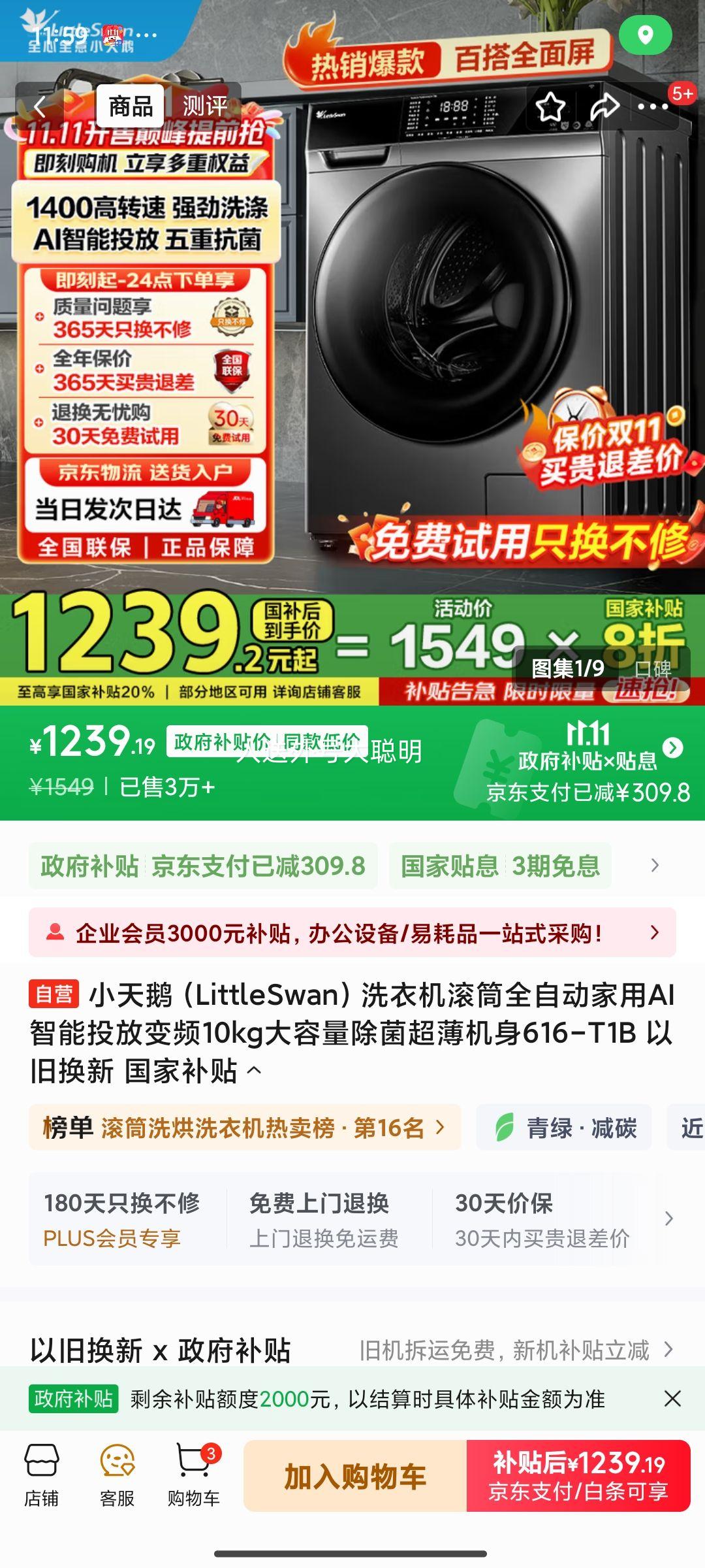 20点:小天鹅 浣彩系列 TG100VT616WIADY-T1B 滚筒洗衣机 10kg