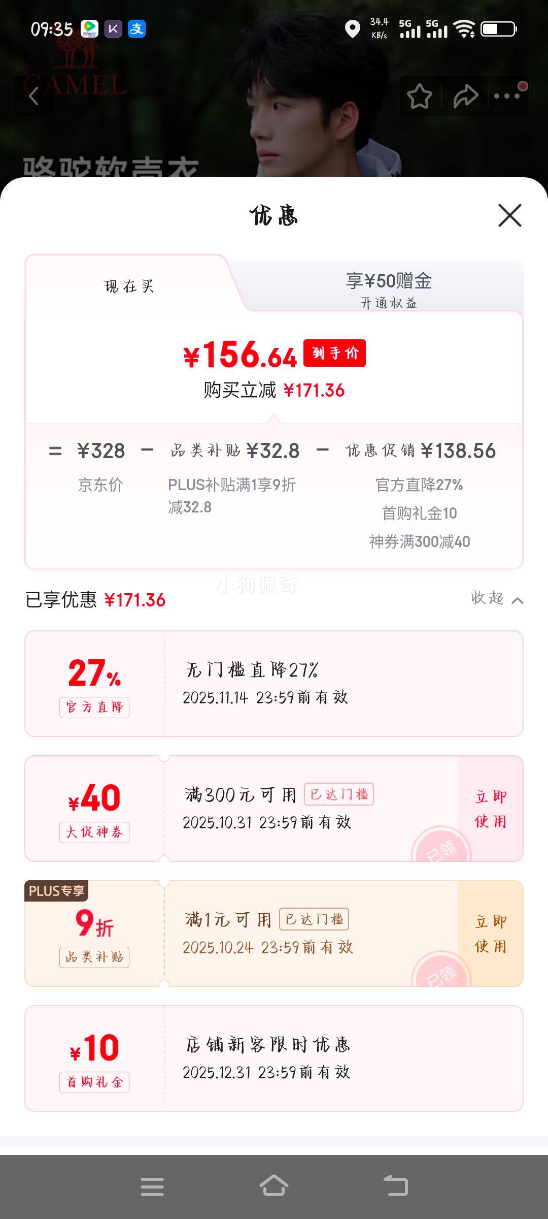 京东双11优惠活动,原价328,现在到手价156.64元,官方直降27%,满300减40,首购礼金减10,plus补贴满1件享9折优惠。