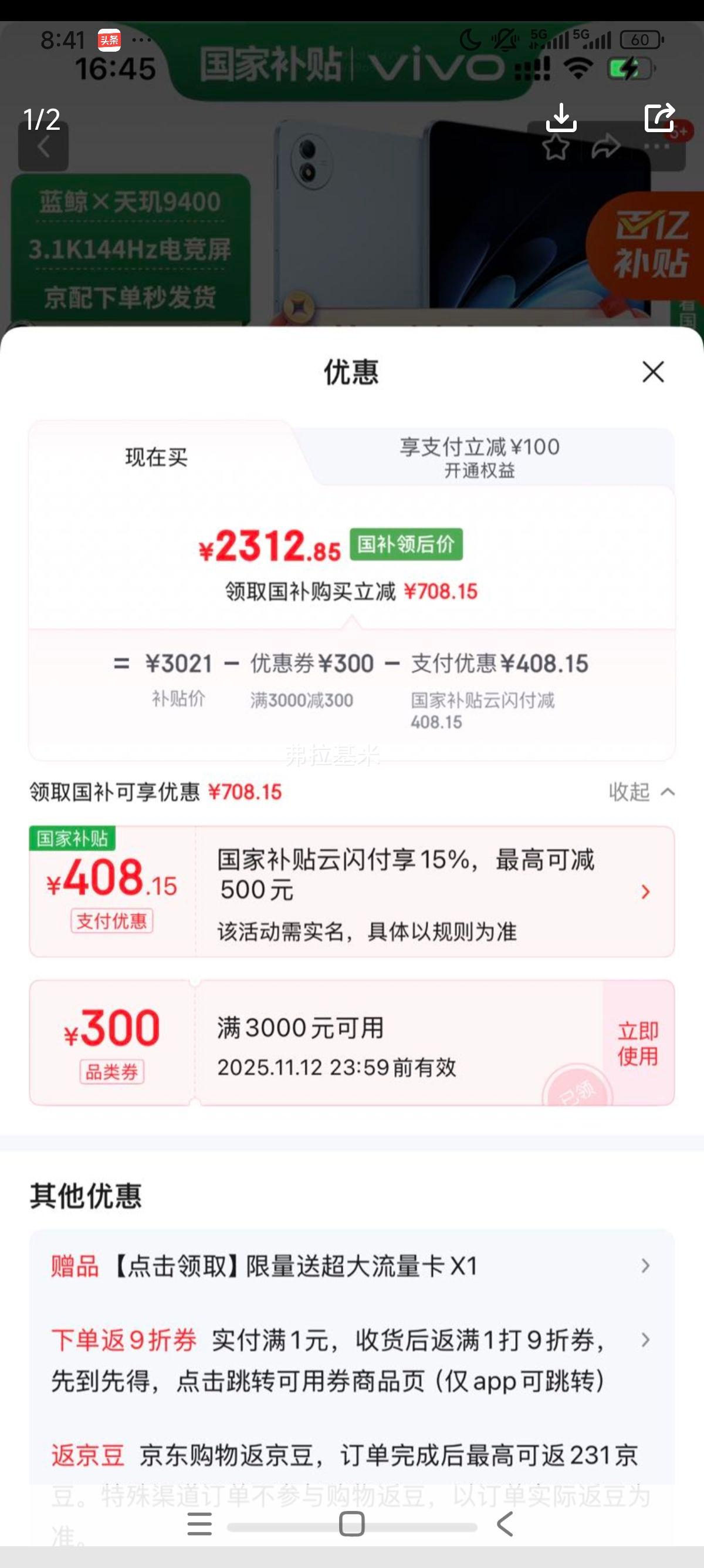 售价3021元,下单领取满3000减300元,晒单返10元红包,参与15%起减408.15元优惠活动,下单1件,实付低至2302.85元。