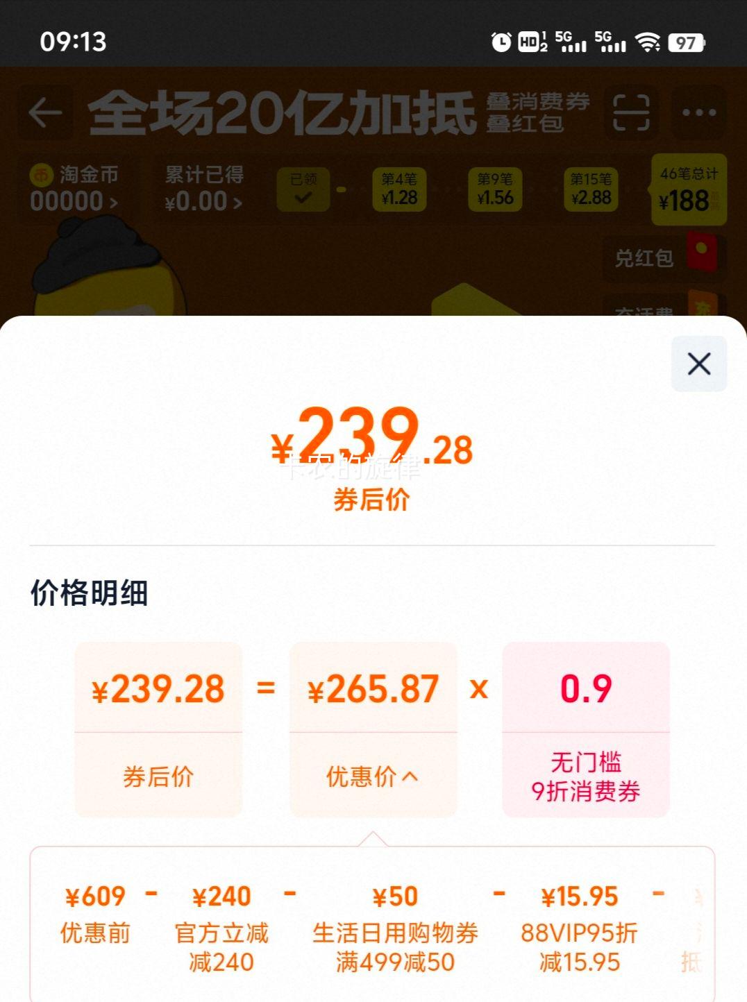 239.28元包邮+3718淘金币(返天猫卡50元后189.28)