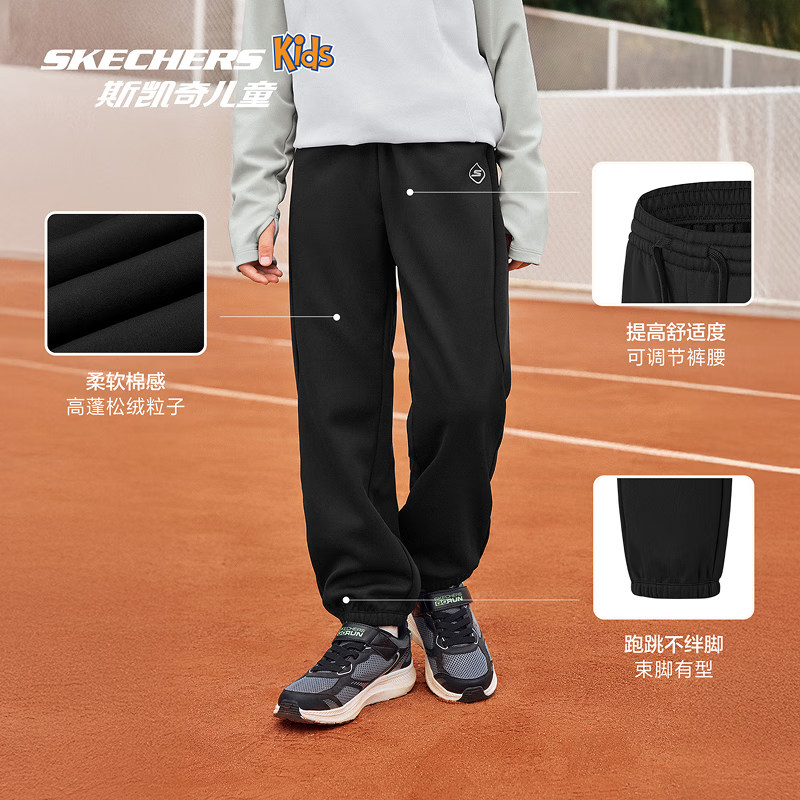 Skechers斯凯奇2025年秋冬新款儿童舒适针织长裤男女款休闲裤子L325K061 加绒/碳黑/140
