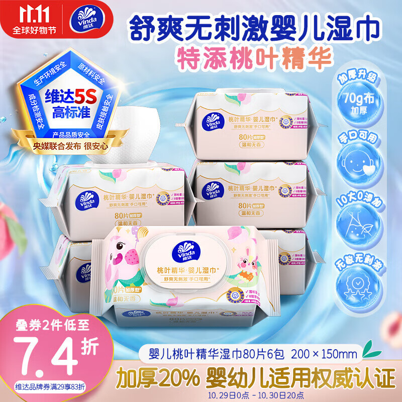 维达(Vinda)婴儿手口湿巾 桃叶精华加厚加大手口专用亲肤湿纸巾大包 80片*6包