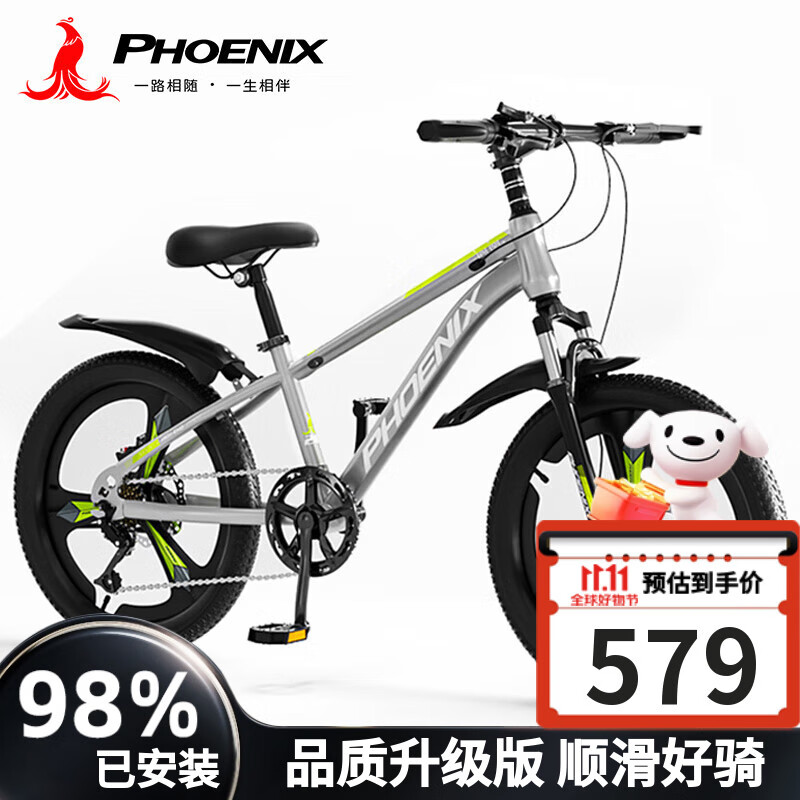 凤凰儿童山地自行车单车6-12-15-18岁青少年减震变速22寸灰绿色礼物
