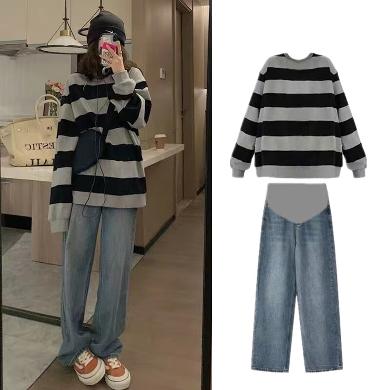 苒祺祺孕妇装春秋上衣卫衣网红时尚套装秋季2025新款长袖遮肚秋季两件套 条纹卫衣+牛仔托腹裤(套装) XL