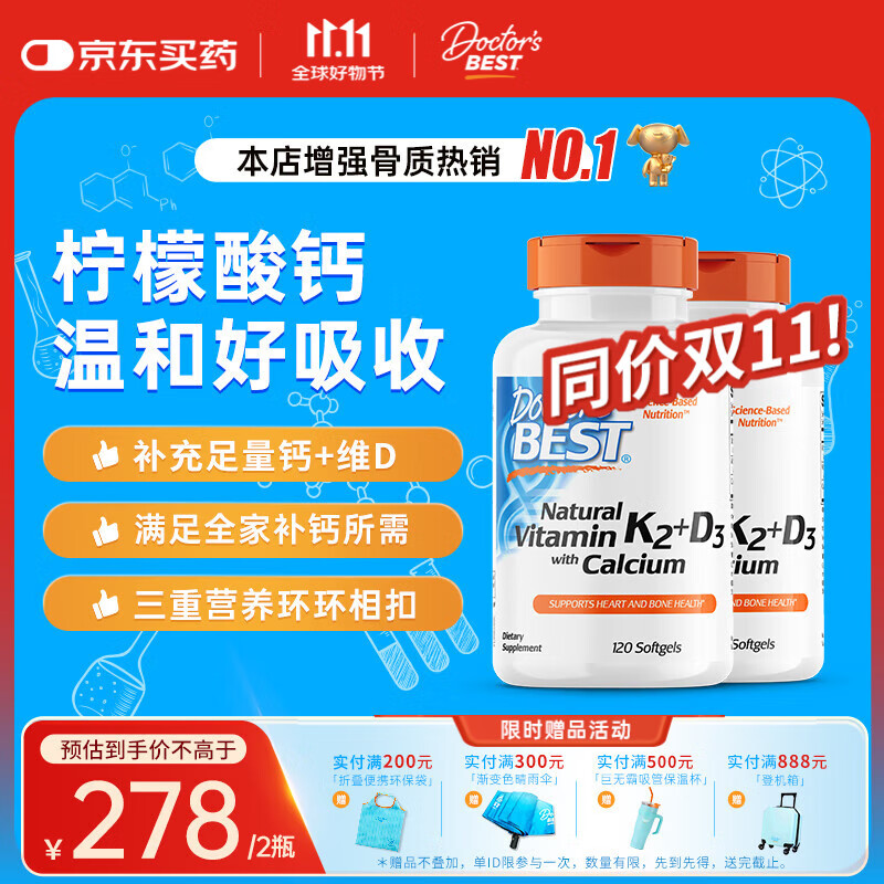 Doctor's best多特倍斯金达威K2D3钙柠檬酸钙碳酸钙中老年成人孕妇补钙美国进口 【家庭装】K2+D3柠檬酸钙*2瓶