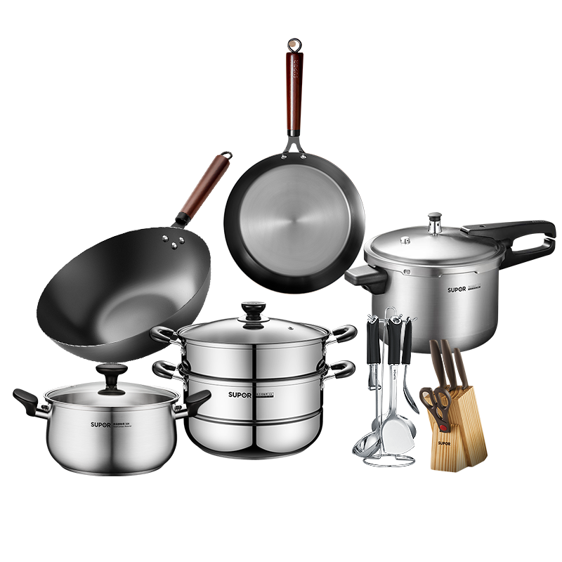 苏泊尔(SUPOR)无涂层铁锅炒锅煎锅套装平底锅炒菜304不锈钢炖煮蒸锅汤锅高压锅 【炒+煎+汤+蒸+压+铲勺+刀具】 7件套