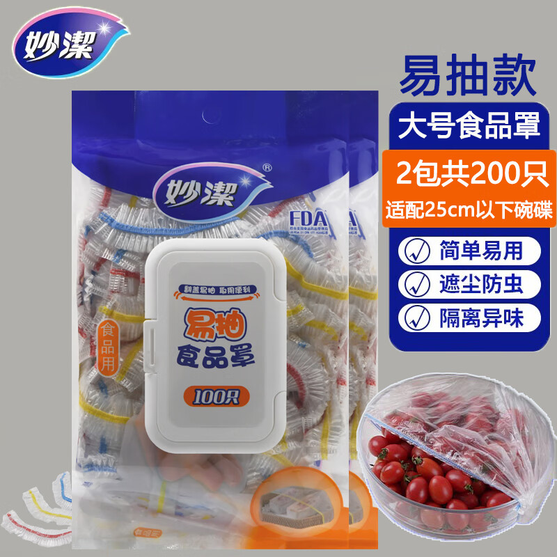 妙洁易抽保鲜膜套一次性食品级家用保鲜膜袋保鲜膜罩保鲜袋套饭菜头罩 易抽食品罩*2包共200只