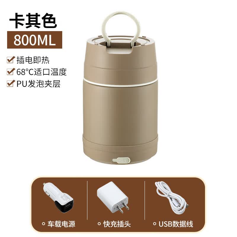 美的你加热饭盒USB充电焖烧杯恒温饭盒早餐杯 上班带饭插电车载保温提锅 卡其色USB+充电插头+车载插 800m 800毫升