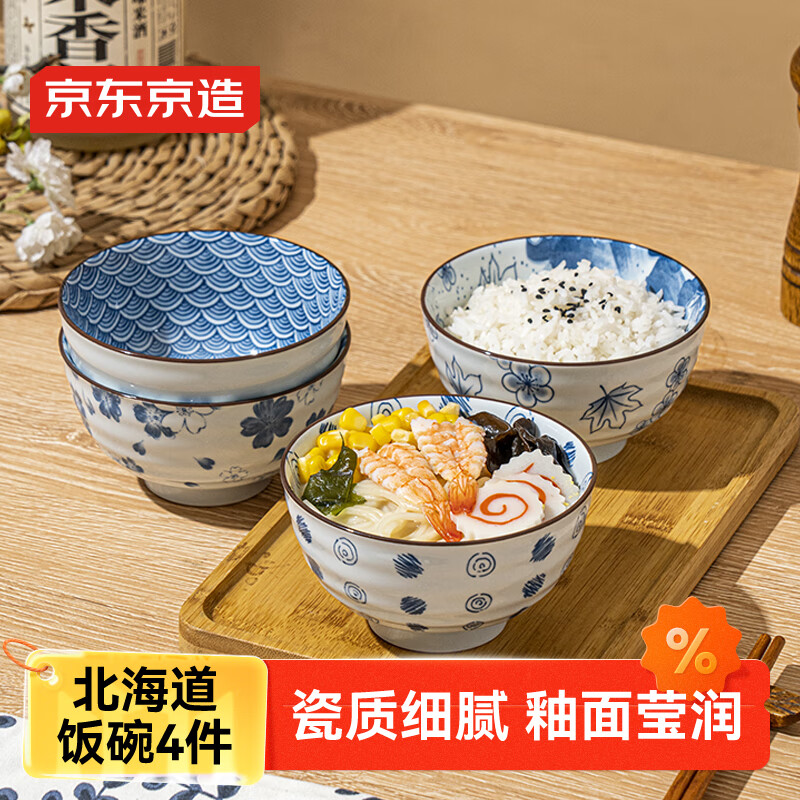 京东京造 碗 汤碗泡面碗饭碗家用陶瓷碗餐具碗盘套装 北海道4.5英寸碗*4