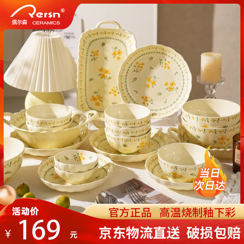 百亿补贴:佩尔森釉下彩碗碟套装家用小清新陶瓷碗盘套装组合乔迁送礼餐具整套 【次日达礼盒装】春意萌6人食29件套