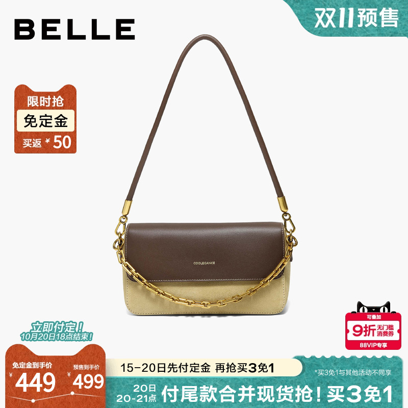 杏色 【双11预售】百丽包女2025新款新月光宝盒复古撞色单肩斜挎小方包