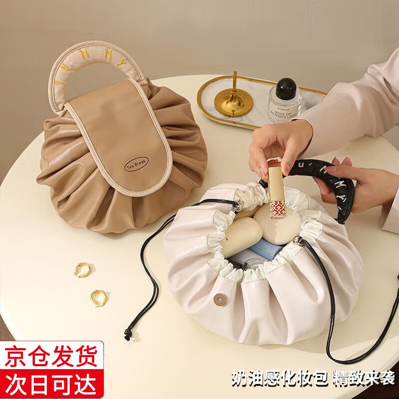 斐月伽化妆包洗漱包女旅行包便携收纳大容量抽绳化妆包出差折叠洗漱包 化妆包【奶杏色】