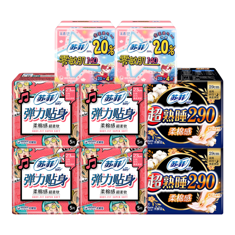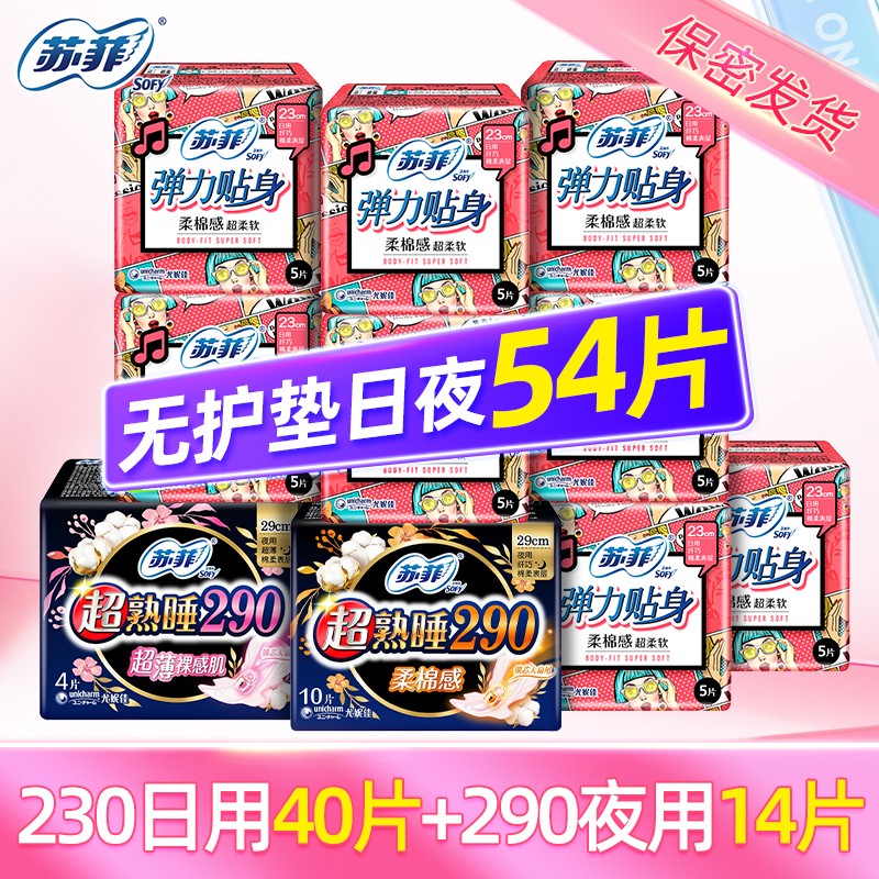 苏菲卫生巾230日用290夜用棉柔弹力贴身140护垫组合姨妈巾整箱批发 日夜组合62片 裸感2片