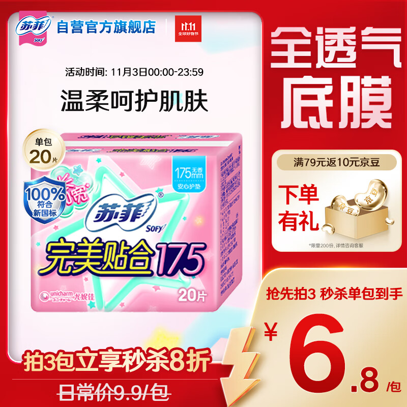 苏菲完美贴合175mm20片 无香型棉柔加长加宽护垫迷你日用卫生巾