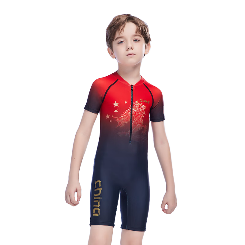 洲克ZOKE儿童泳衣男童连体平角温泉短袖123503544 黑红金中国龙花 16