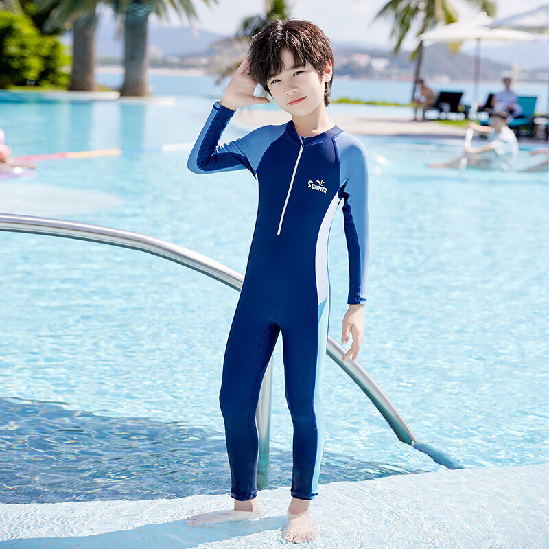 佑游男童泳衣长袖连体中大童防晒游泳馆速干游泳四件套32685深蓝色3XL