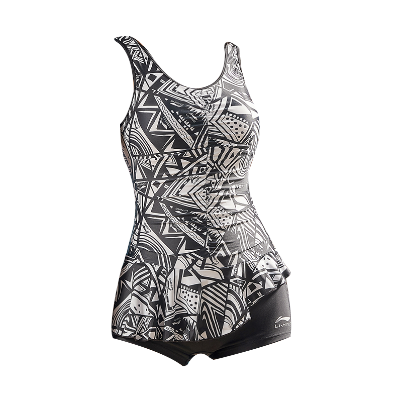 李宁(LI-NING)泳衣女士运动连体保守泳衣遮肚显瘦小胸聚拢舒适透气平角温泉泳装 黑色印花(假两件) XL (160-172cm)(56-62kg)