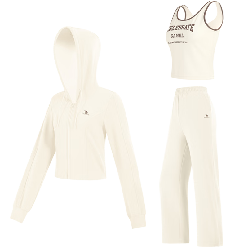 骆驼(CAMEL)连帽三件套女阔腿瑜伽运动休闲套装 Y24CA4L0634 浅杏白 M
