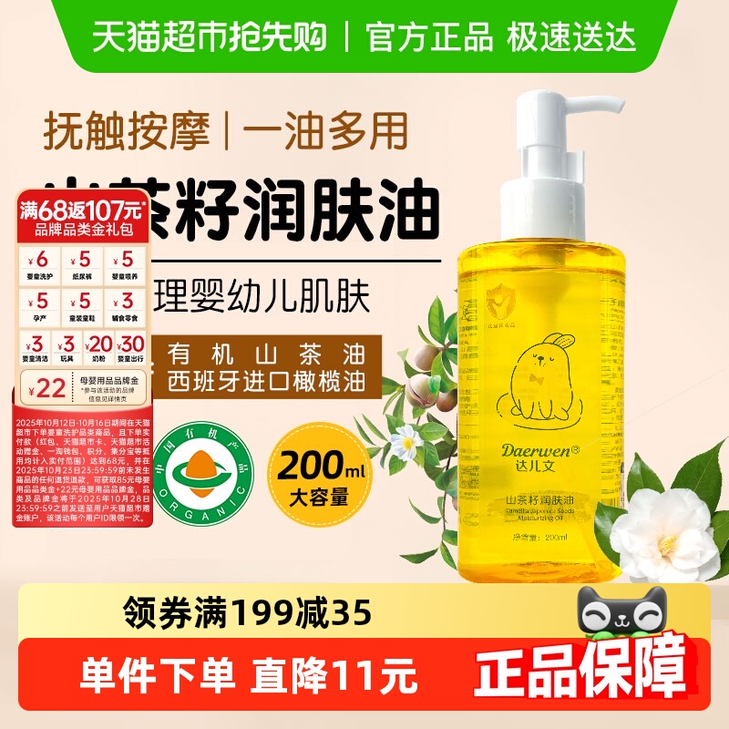 顺丰包邮达儿文有机山茶籽润肤油200ml婴儿专用按摩抚触油身体油