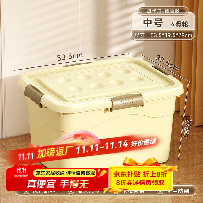 纳份爱【出口品质】收纳箱加厚超大容量带盖家用衣服杂物塑料整理搬家箱 奶油黄-中号【53*39*29cm】4扣4轮 3个装【升级密封】