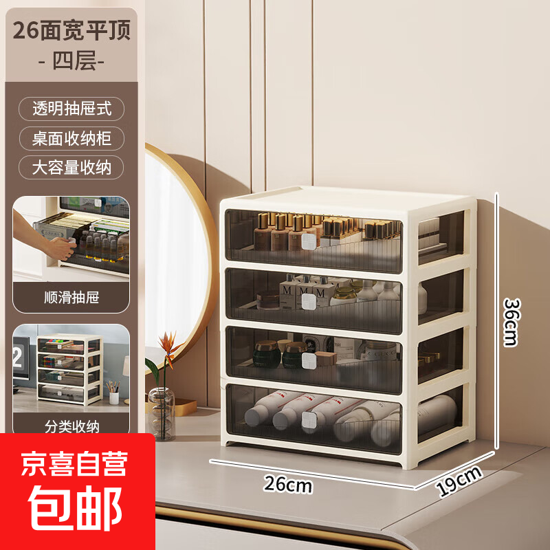 桌面收纳盒大容量透明多层抽屉式化妆品收纳盒宿舍杂物文具置物架 【平顶款】【大号】-四层