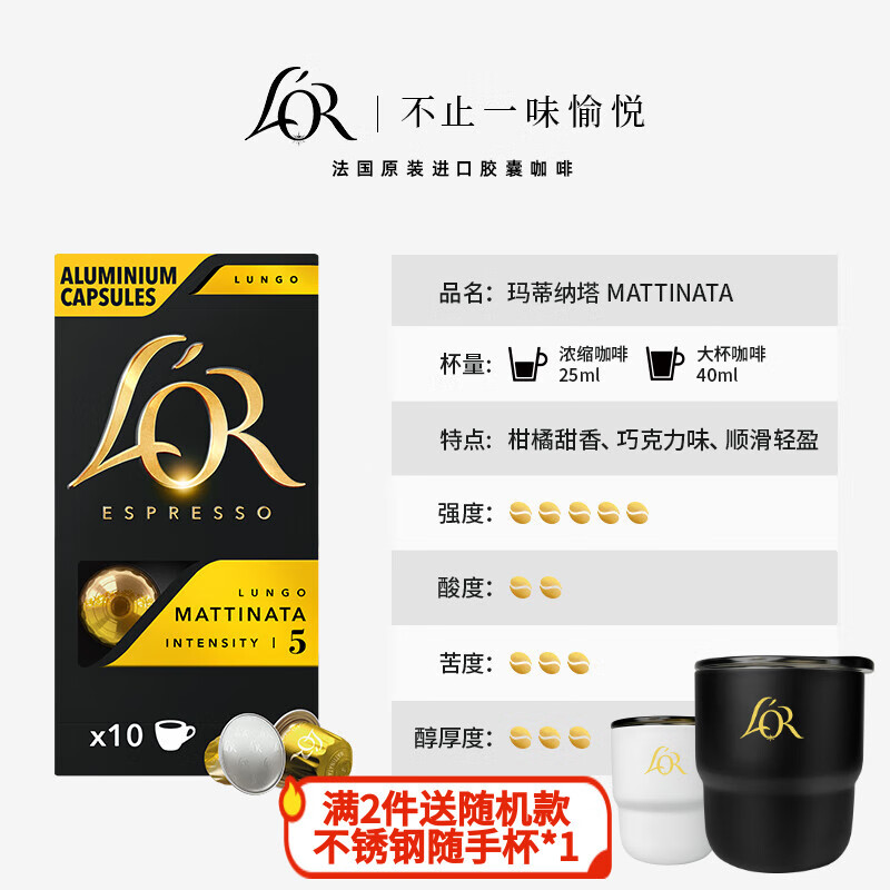 L'OR【送随手杯】咖啡胶囊阿拉比卡豆法国进口lor适用小米雀巢咖啡机 玛蒂纳塔(26.02)买2送随手杯