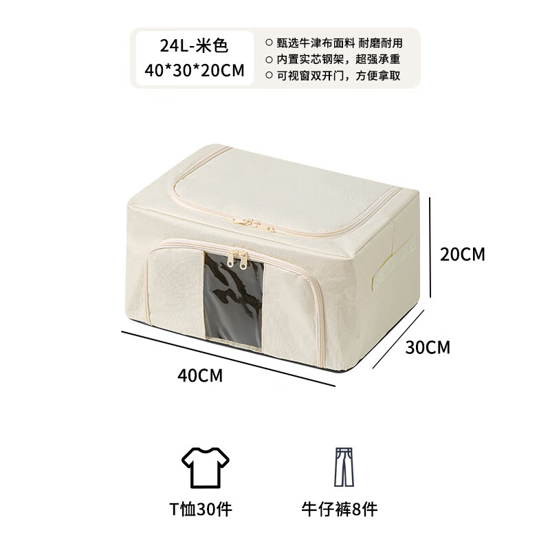 洁百牧衣服收纳箱可折叠单窗可视衣裤收纳大容量布艺防尘防潮杂物储物箱 百纳箱米色【24L】