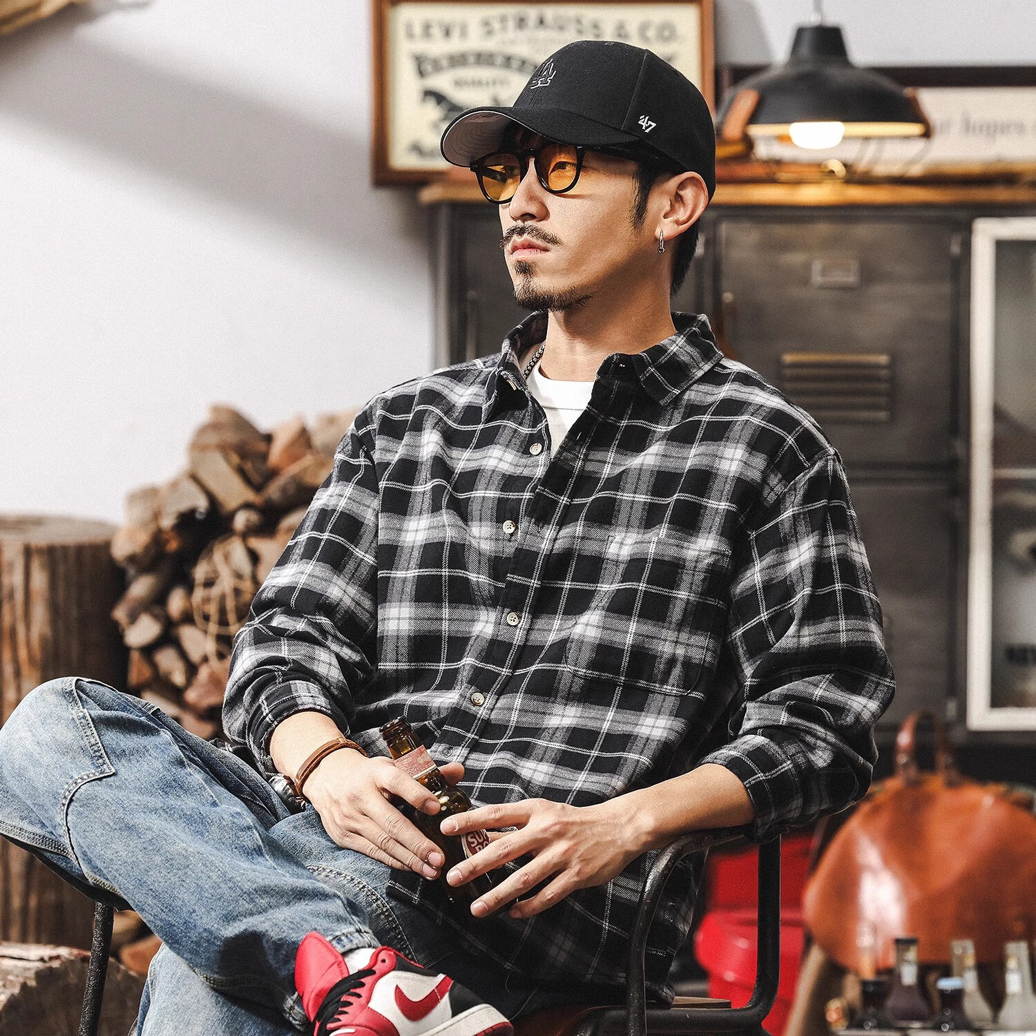 杰雷诺美式复古格子衬衫男长袖纯棉秋季2025新款潮牌宽松休闲衬衣男外套 黑色 XL 适合140-160斤