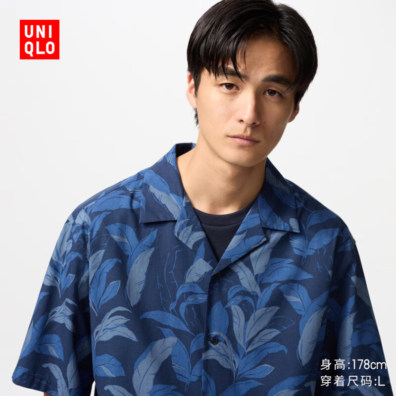 优衣库男装女装莫代尔棉混纺印花开领衬衫短袖古巴领度假风474522 69 藏青色 XS /160/76A