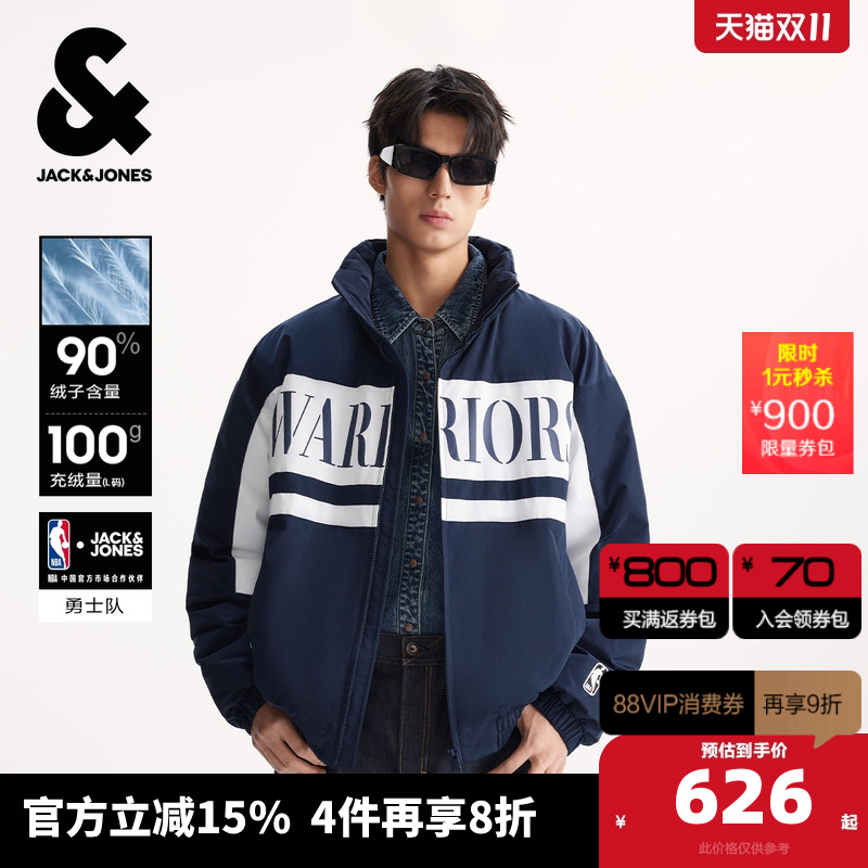 E39藏蓝 165/88A/XS 杰克琼斯冬季新款NBA联名勇士队休闲百搭贴布立领保暖羽绒服男装