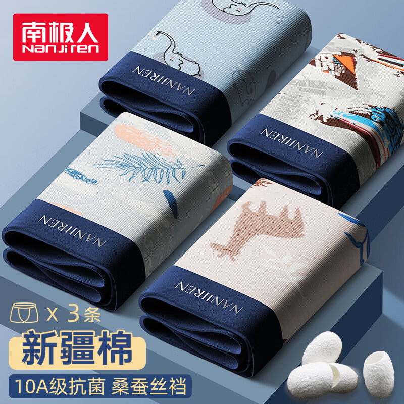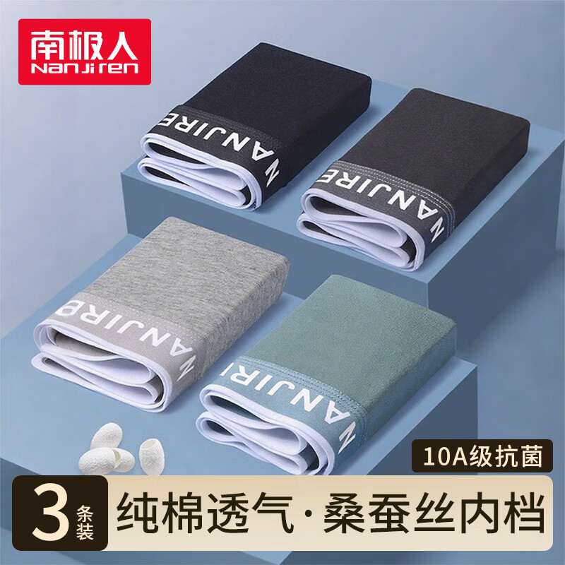 百亿补贴:南极人男士内裤男纯棉10A抗菌含蚕丝平角新款男生四角短裤头3条XL