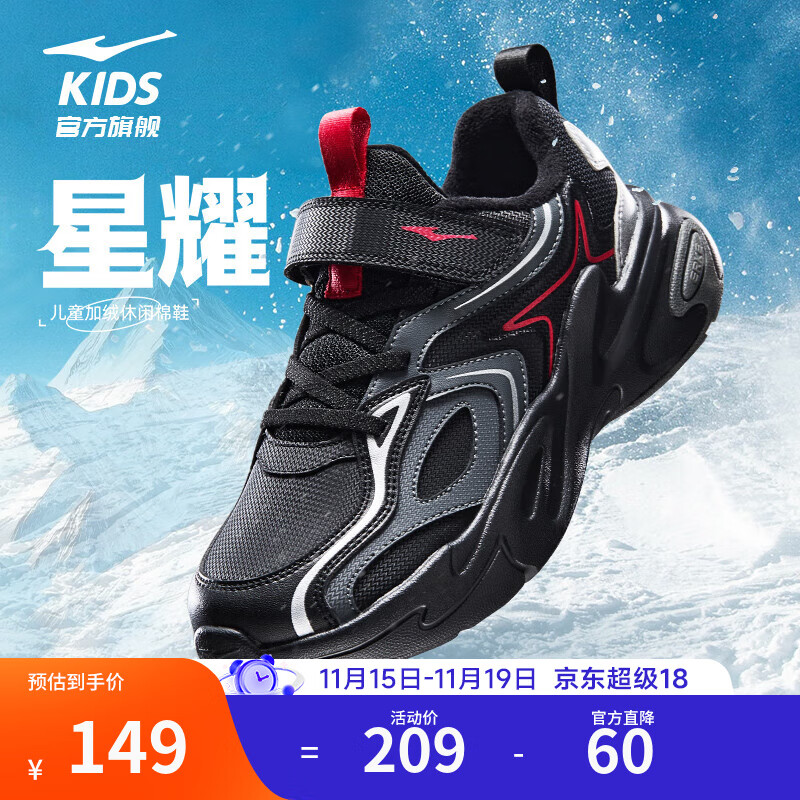鸿星尔克儿童棉鞋男女童加棉跑鞋冬季革面加绒保暖运动中大童丨星耀2 正黑/碳灰/亮银 26