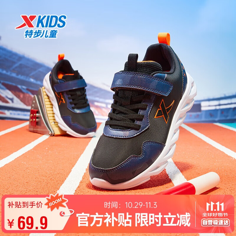 特步童鞋儿童革面魔术贴跑鞋轻质防滑运动鞋 黑/深邃蓝 35