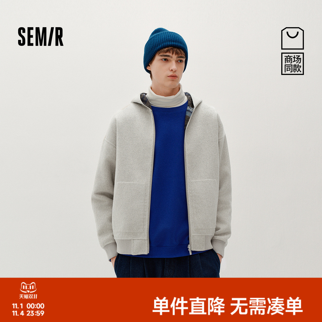 商场同款|森马毛呢外套男冬格纹双面穿2025新款情侣韩系连帽上衣