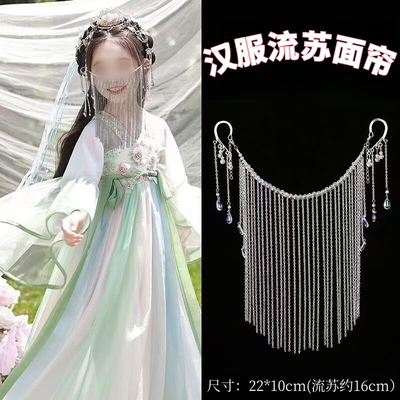 捷懿儿童汉服面具遮脸流苏挂耳面纱女童古风面帘头饰女孩古装配饰 1个装【银色-耳挂流苏面帘】